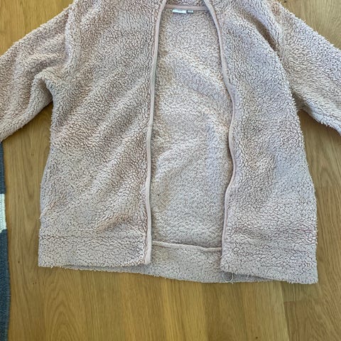 Fin jacka / kofta med blixtlås i teddytyg, som blivit liggande underst i garderoben och redan urvuxen, använd endast ett par gånger, som ny.