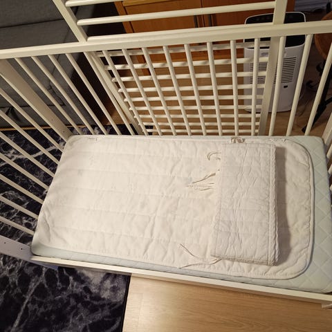 Barnsäng, spjälsäng... Bra brukat skick med fräscha tvättade tillbehör. Madrass och spjälskydd. Mkt sparsamt använd.