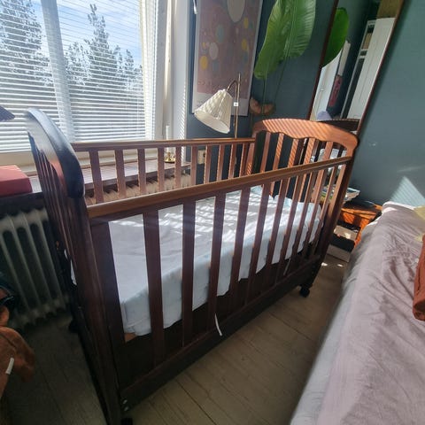 Gammaldags, grönmålad, utdragbar spjälsäng inklusive ny madrass och spjälskydd