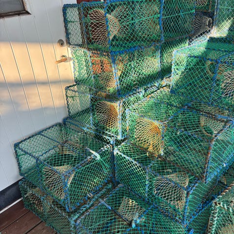 Inplastade galvaniserade stommar 90*45*40 cm försedda med dubbla ingångar, svältkammare, dubbla flyktöppningar och spöktråd enl. gällande regler. Vikt 10-11kg. Passar för hummer och krabbfiske. Linset, Kula 20cm + 15msjunklina + 15m flytlina