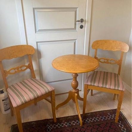 Köksbord med Singer symaskinsunderrede i gjutjärn. Mått 180x100 cm. Fyra svarta stolar och två i björk alla omklädda i tyg från Marimekko brun/svart blomma.