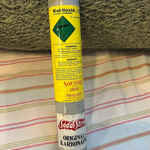 Den funkar som den ska. Utan kolsyrepatron eller tillbehör. Missfärgning på halva.