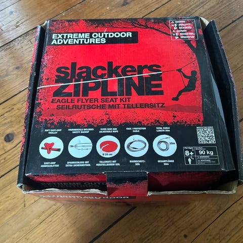 Helt oanvänd och oöppnad Slackers 90ft Eagle Series Zipline Kit med säkerhetsbroms. Perfekt sommaraktivitet för hela familjen!