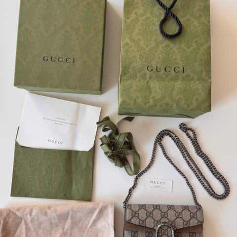 Säljer min Gucci mini väska då jag aldrig använt den, köptes år 2021. Kvitto finns på begäran. Mått: W16.5cm x H10cm x D4cm