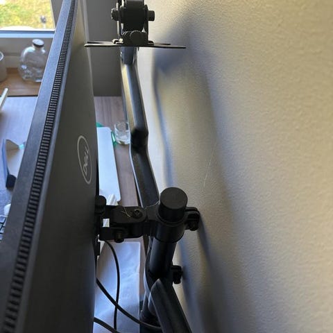 Gedigen, tung, metallkonstruktion, inget som går sönder i första taget. Sätts fast i skrivbordsskivan med integrerad klämma.