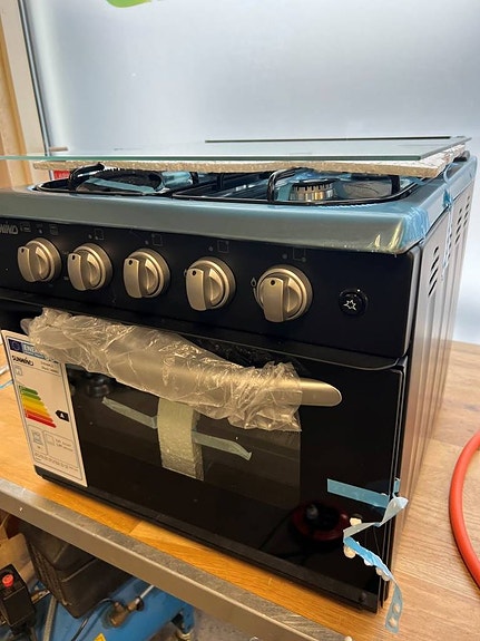 Fyra kraftiga gasollågor och ugn med 12v-tändning och belysning i ugn