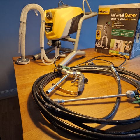 Mycket bra färgspruta från Wagner, sprutar jämt och fint med vanlig färg. Perfekt till tak, möbler, väggar mm