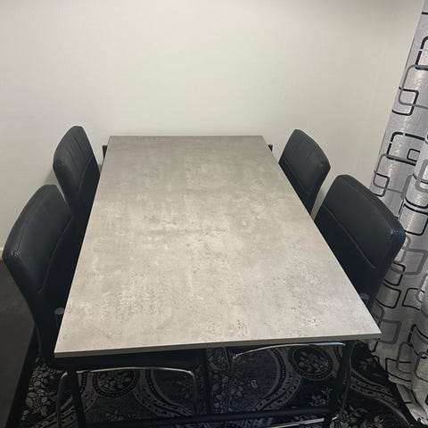 Vit bord med fyra svarta stollar (skinnimititaion)1499 kr ,bra skick