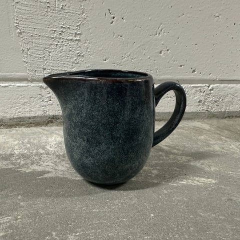 Fin,söt liten grädde/mjölkkanna av stengods. Oanvänd, har bara stått i skåpet, säljes nu till bättre behövande. Ungfast,mikrovåg säkert, tål diskmaskin, ca 26 cl. H 9,5 /D 6,5/5,5 .
