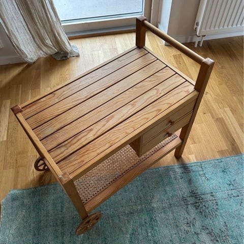 Fin serveringsvagn i furu och vad som ser ut som rotfaner (masur) eller eventuellt någon slags kork.