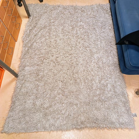Mjuk matta i bomull i beige färg med grön prickar i olika storlekar. Mått 86,5 cm bred och 147 cm lång. Kan hämtas på Fridhemsgatan vid Fridhemsplan.