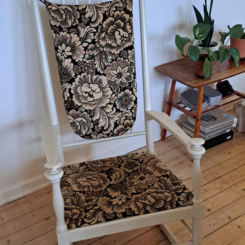 Gungstol av äldre modell. Träet i mycket bra skick. Tyg och stoppning i ok skick utan skador.