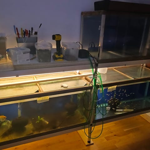 Ställning med 3 akvarie och ljusramp. Ställning är 65x35x144 cm. Total höjd inkl. akvarie och ljus ramp är 186 cm. Alle akvarie er tät. Tömning igår. Ingen fisk eller filter i priset. Kan köpas for extra om du behöver Hämtas på plats. Skickas inte.