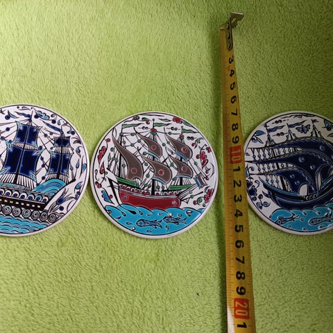 Diameter 36 cm. Två av faten är signerade: "Thomas" (Thomas Hellström). På framsidan på två fat finns etiketten med "Nittsjö" kvar. Keramik. Fina. Säljes tillsammans för 900 kr.