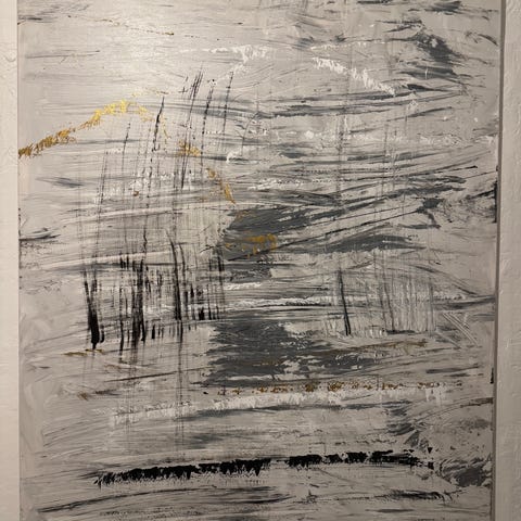 En vacker inramad abstrakt målning i grå, vita och guldtoner. Målningen är målad med struktur och har en texturerad yta. Den är perfekt för att skapa en modern och stilren inredning.