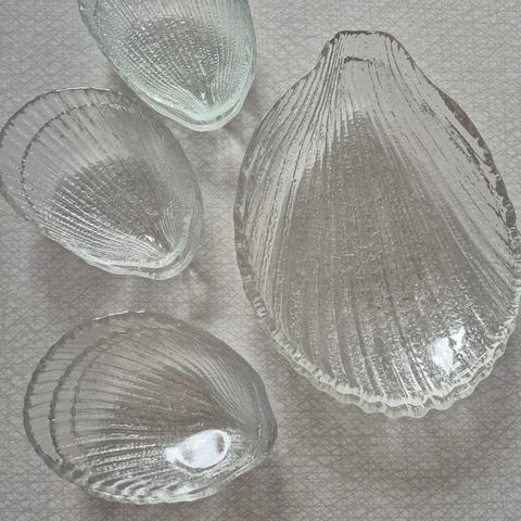 Två mindre snäckformade skålar i glas säljes för 50 kronor tillsammans.