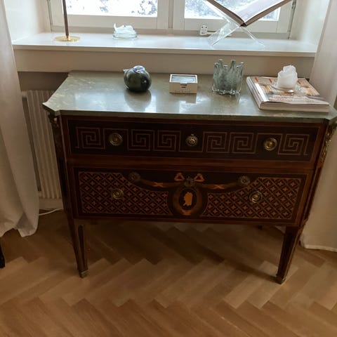 Sökord: Rokoko, Hauptbyrå, marmorskiva, mässingbeslag, antik,