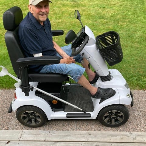 En Rullator som lätt tar sig fram på skogsstigar över rötter och stenar. Bra förvaringsmöjligheter och den är stabil.