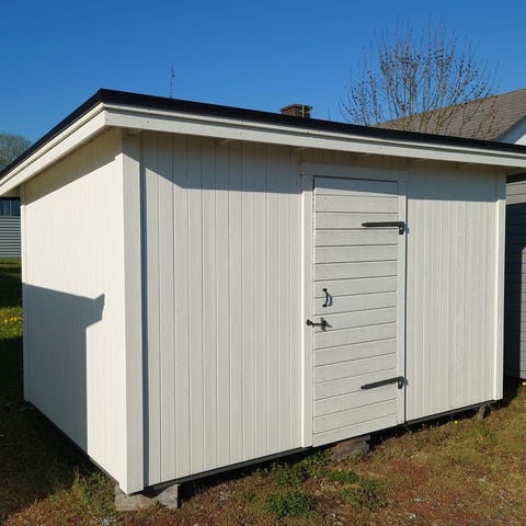 Modulhus. 20 kvm. Stålstomme med 40 mm isolerade väggpaneler, 80/40 mm isolerade takpaneler och 100 mm isolerade golvpaneler. Nästan helt bultad konstruktion. Takpanelerna måste skruvas fast. Supersnabb montering. Bör inte ta mer än en dag att montera. Kan kläs med trä etc. Höjdjusterbara ben för ojämn mark
