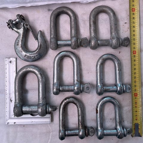 Bygelschackel för marint bruk, låses med splittad saxsprint. Ytbehandling bitumen.