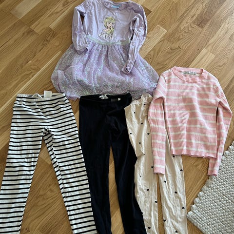 En hoodie (lite smutsig), en klänning, tre par byxor (fläck på rosa se bild), strumpor. Gärna avhämtning. Kan aktivera gratis frakt.