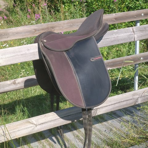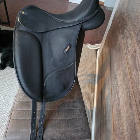 Svart vid dressyr, har suttit på ett halvblod.