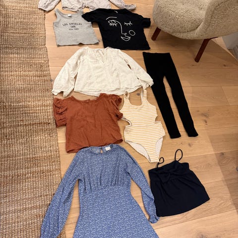 -tre klänningar, två linnen, tre stickade överdelar, ett par träningstights, sex par pants, fyra collegetröjor, ett par snickarbyxor, ett par mjukisbyxor, två par jeans, ett nattlinne, ett par trekvartspants, en spetstopp, ett par strumpbyxor, sex t-shirts kort ärm , en långärmad t-shirt.