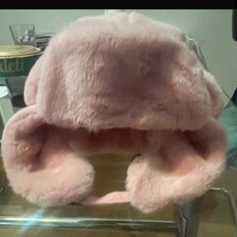 En en rosa mössa med två fluffiga rosa pompoms från Åhléns . Strl 50-51
