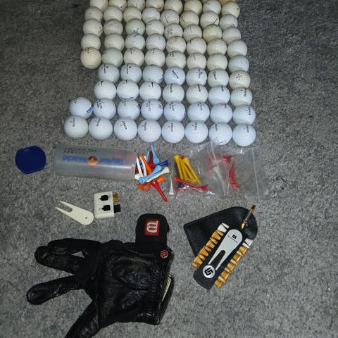 87 st nya golfbollar: peggar samt ett paket skospikar