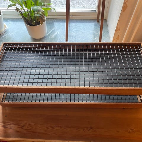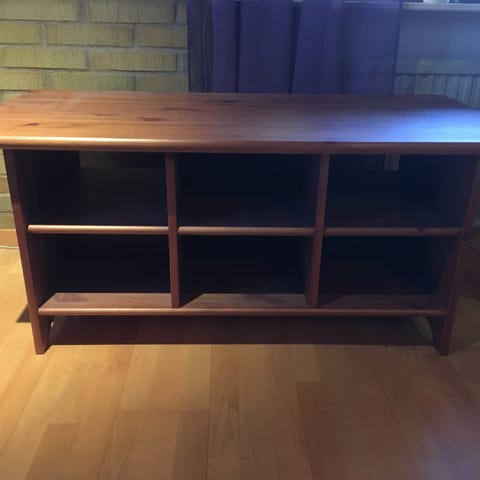 Stor skohylla troligen i lackad furu. Rymmer många skor i olika storlekar.