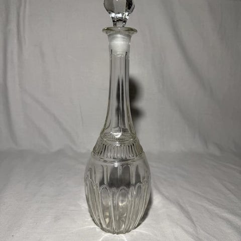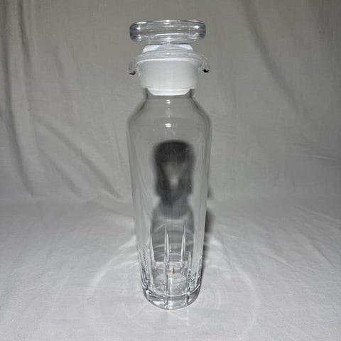 Karaff i munblåst glas av bra kvalitet, 30 cm. hög och 17 cm. bred, plast för 1 - 1,5 liter vin eller annan dryck. Fin effekt med färgad dryck i karaffen. Se bifogad bild.
