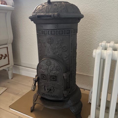 Renoverad fungerande Kvarner Gjutjärnskamin i mycket fint skick, höjd 180cm från troligtvis slutet 1800 talet eller början 1900 talet. Hämtas