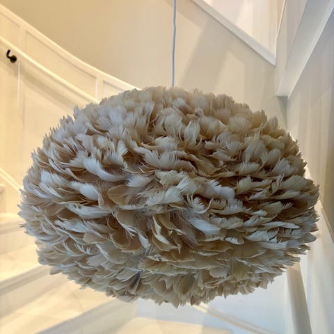 Eos lampskärm är tillverkad av äkta gåsfjädrar och skapar ett mjukt och behagligt ljus i rummet. Perfekt att hänga över ett bord, i hallen eller varsomhelst i hemmet där du vill öka mysfaktorn istället för att ha ett starkt bländande ljus. Det finns en Eos för varje rum och installationsform så att du slipper kompromissa din inredningslust.