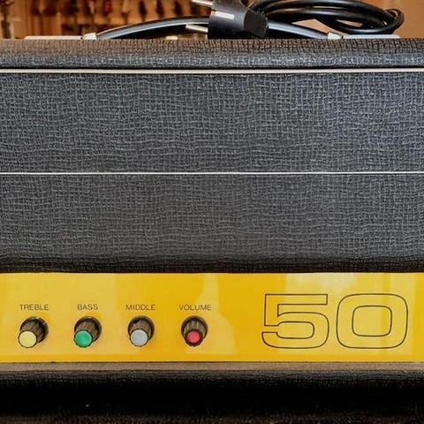 Här är en härlig vintageförstärkare som inte så många idag känner till, eller kommer ihåg ens om man var med på den tiden. Förstärkaren levererar 50 inte så extremt högljudda watt och är byggd enligt Hiwatts och Selmers tradition, den distar inte när du vrider på max volym utan får en lätt slutstegskompression som gör att din ton hänger lääääänge.