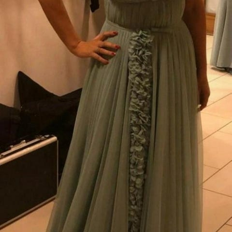 Otroligt vacker svart långklänning med en stilren och tidlös design. De dekorativa banden vid axlar, midja och nederkant ger klänningen en exklusiv och figursmickrande silhuett. Perfekt för bröllop, fest, gala eller andra högtidliga tillfällen.