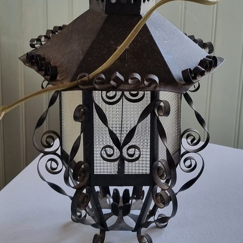 Rustik fungerande golvlampa i smide, äldre modell med mycket patina. Glas runt belysningsdelen.