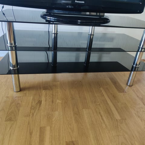 Fin glas tv bord i ny skick Mått fram : 120 cm. Bak: 110 cm. Höjd: 51 cm