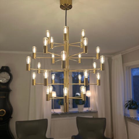 Säljer jättefin taklampa från Herstal, modell Manola med 20 dimbara lampor med originallampor. LED. Matt mässing
