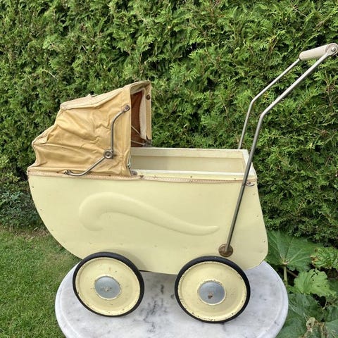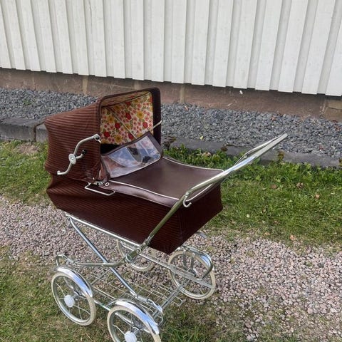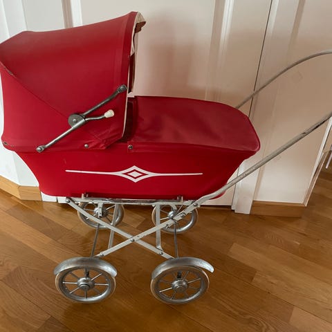 Gammal vintage dockbarnvagn, troligen från slutet av 1950-talet. Gummit på ett av hjulen saknas o lite mindre fläckar här o där men i stort sett i bra begagnat skick med tanke på åldern. Finns på Norrstrand i Karlstad.