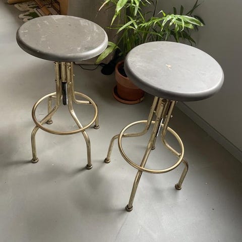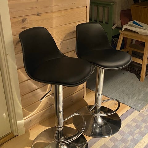 Höj /sänkbara barstolar i krom med sittdynor i "fuskskinn" & med fotstöd. Bra skick men sömmen har släppt på 2 ställen på båda stolarna (se bild)