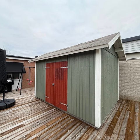 Gediget snickrad redskapsbod alternativt lekstuga där du som vuxen kan stå upprätt invändigt. Huset har takplåt och rejäla reglar.