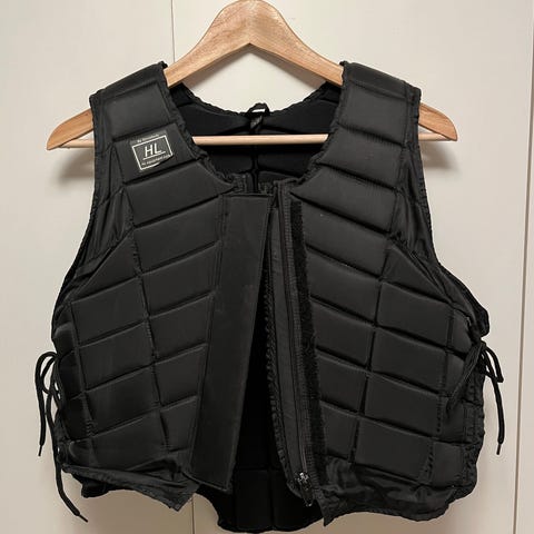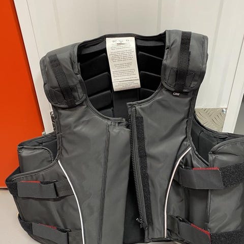 En säkerhetsväst som stängs med dragkedja fram. Är justerbar med kardborre vid axlarna och med snören i sidorna. Väl använd. Storlek XS. Säljes på grund av att jag lagt ridningen på hyllan.