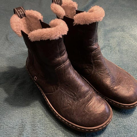 Klackhöjd 6,5 cm. Mockastövlett med innerfoder i fleece. Endast använda en gång. Köpta för 1000 kr.