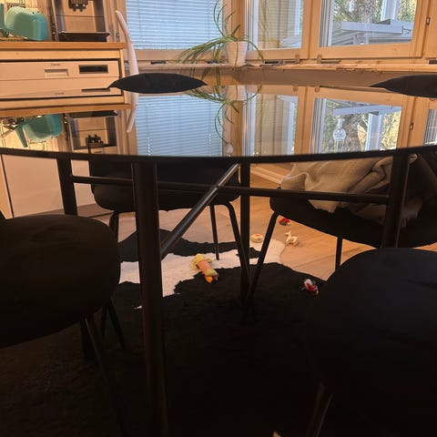Ett trevlig matbord med plats för 8 stolar köpt på Mio. Bordet har en del repor samt märken på bordsbenen dock är det inget som påverkar helhetsintrycket.