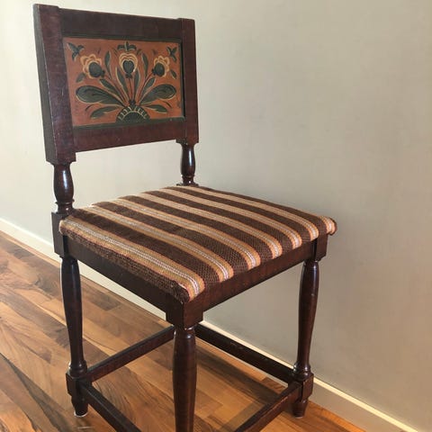 Äldre handgjord super stabil stol. Målad med fina blommor, allmogemålat, 1900-tal. Finns spår av livet, som tex skav och sprucken färg. Tung så det tål att dansas på om det behövs.