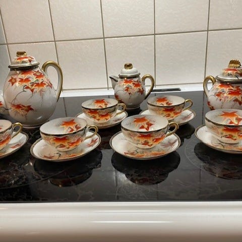 En vacker teservis från Victoria China Czechoslovakia. Denna servis inkluderar en tekanna, en sockerskål och fyra tekoppar med tillhörande fat