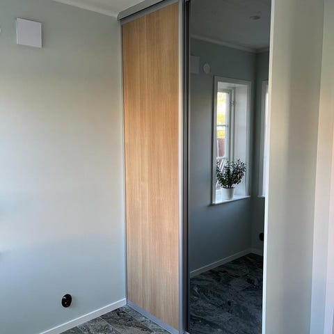 Skjutdörrar Ballingslöv helt nya som på bilden. Fel mått och passade inte i rummet och jag fick beställa nya. Mått bredd på hela lösningen 3160mm x Höjd 2610mm. Två av dörrarna är i mörk ekfanér och skjutdörren i mitten är i rökt glas. Nypris närmare 30.000:-. Säljes endast mot avhämtning.