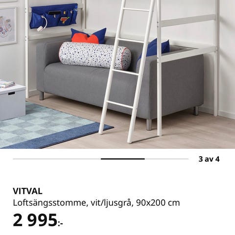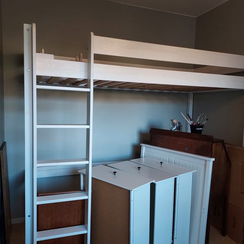 Sängarna säljs styckvis, IKEA-trapphylla ingår ej, kan köpas till; finns 2 st. En av hyllorna är justerad med ytterligare ett mindre steg, för att lättare kunna komma upp i loftet.