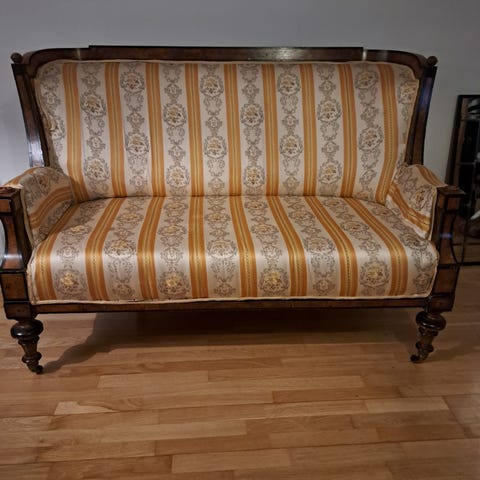 Välbevarad elegant soffa i nyrockoko-stil, soffan är omklädd och troligen renoverad på 60-talet då den inte visar några tecken på att vara nedsutten.