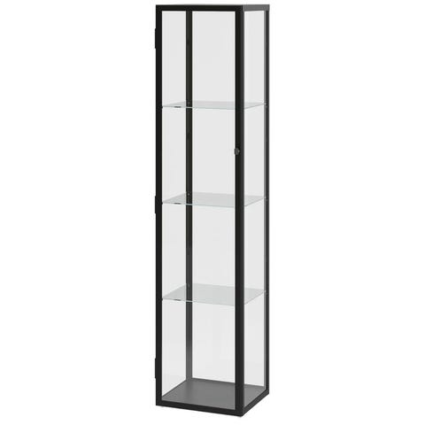 Snyggt och tidlöst väggmonterat vitrinskåp i svart metall med glasdörrar och metallhyllor. Perfekt för att visa upp glas, porslin, samlarföremål eller andra inredningsdetaljer.